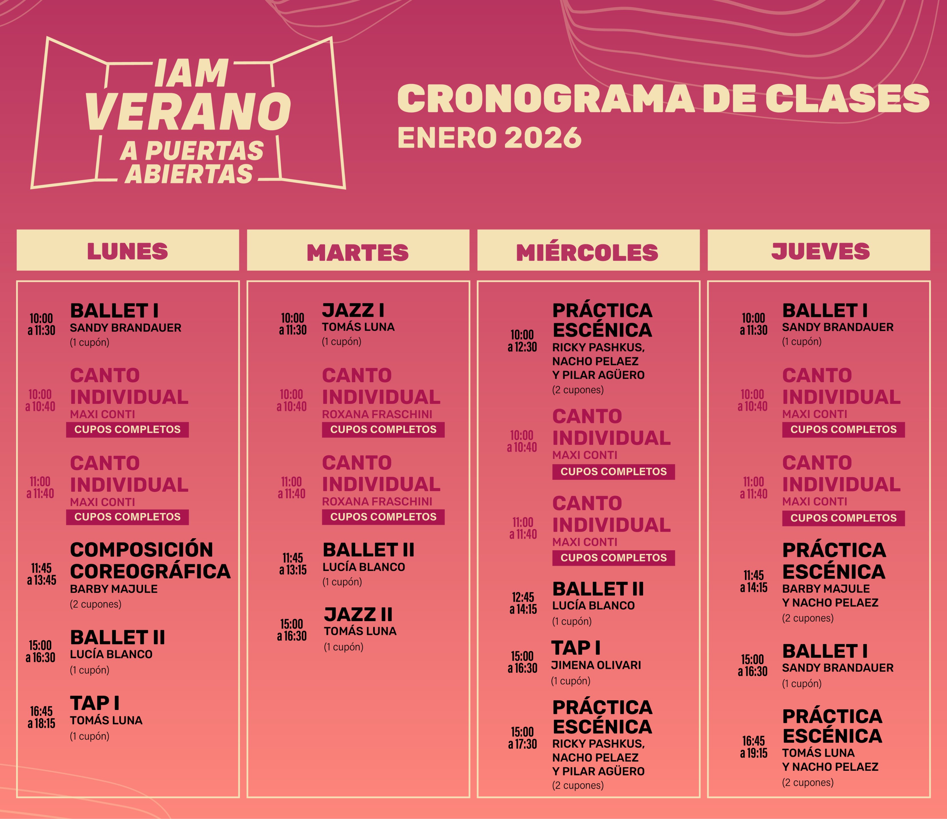 IAM Verano a Puertas Abiertas es nuestro programa de verano pensado para toda la comunidad: alumnos, exalumnos y artistas en general. El objetivo es que todos puedan entrenar durante Enero con una modalidad flexible, intensiva y adaptada al ritmo de las vacaciones.